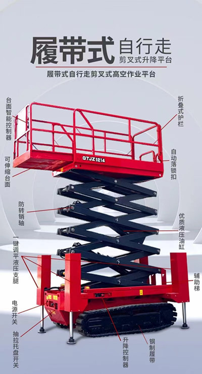 自行式履带升降机也可叫做履带式升降平台,自走式履带升降机,履带式升降机是根据当今市场环境所造就的一款新型升降机,履带式升降机区别于常见的轮式升降机,外形好像履带式装甲车,霸气侧漏,是一款室外复杂环境使用的肌肉型升降机